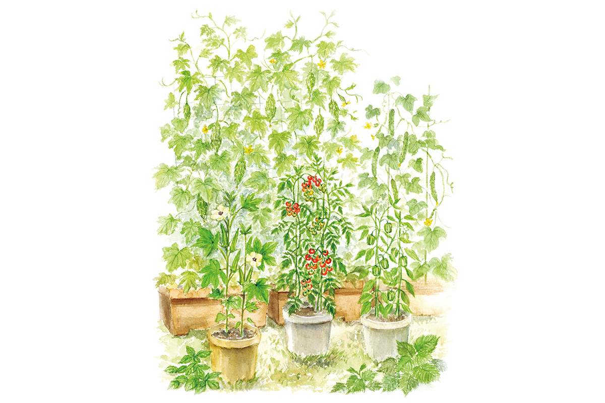 その庭で毎年、プランターや植木鉢に野菜の苗を植えている。庭とは言え借り物なので、苗を地植えするのは躊躇われ、また、台風が来ても鉢植えならば避難が簡単、と思うからだ。定番のトマト、ゴーヤ、ピーマン。それに花が美しいのでオクラも。茗荷、胡瓜。青紫蘇やバジルなどのハーブ類。