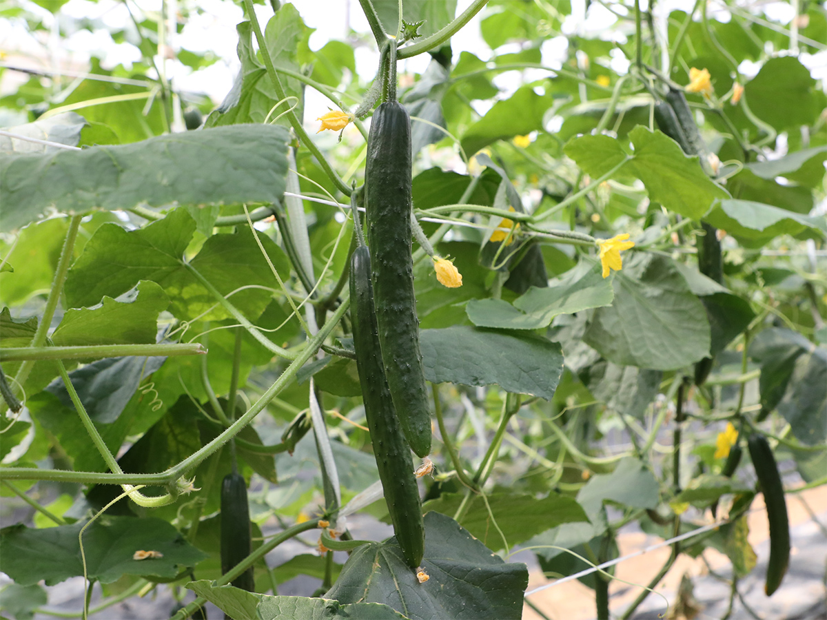 「定植から約1ヵ月で収穫でき、促成栽培は2月に定植して3~6月に収穫、夏秋きゅうりは5月に定植して6~10月に収穫、抑制栽培は8月に定植して9~12月に収穫します。春や秋は加温することが多いですが、中には夏を過ぎて11月まで無加温で収穫する生産者もいます」と阿部さん。生産量拡大と高品質生産を目指し、栽培講習会や生産者同士で畑を回って生育状況を確認する現地検討会、他産地の視察、市場への研修など、さまざまな取り組みを行っています。