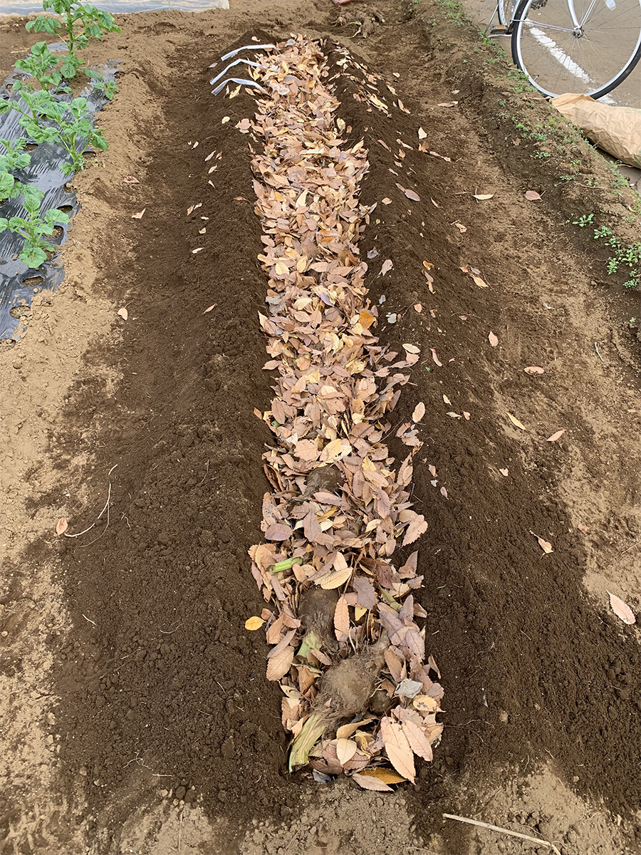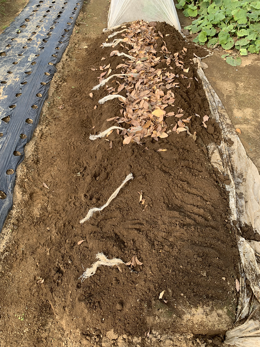 里いもの冬越しは、里いもをネットに入れ落ち葉をひき、土を被せビニールで覆い保存しますが、年により腐ることがあります。親芋は腐ることなく芽が出て定植出来ます。