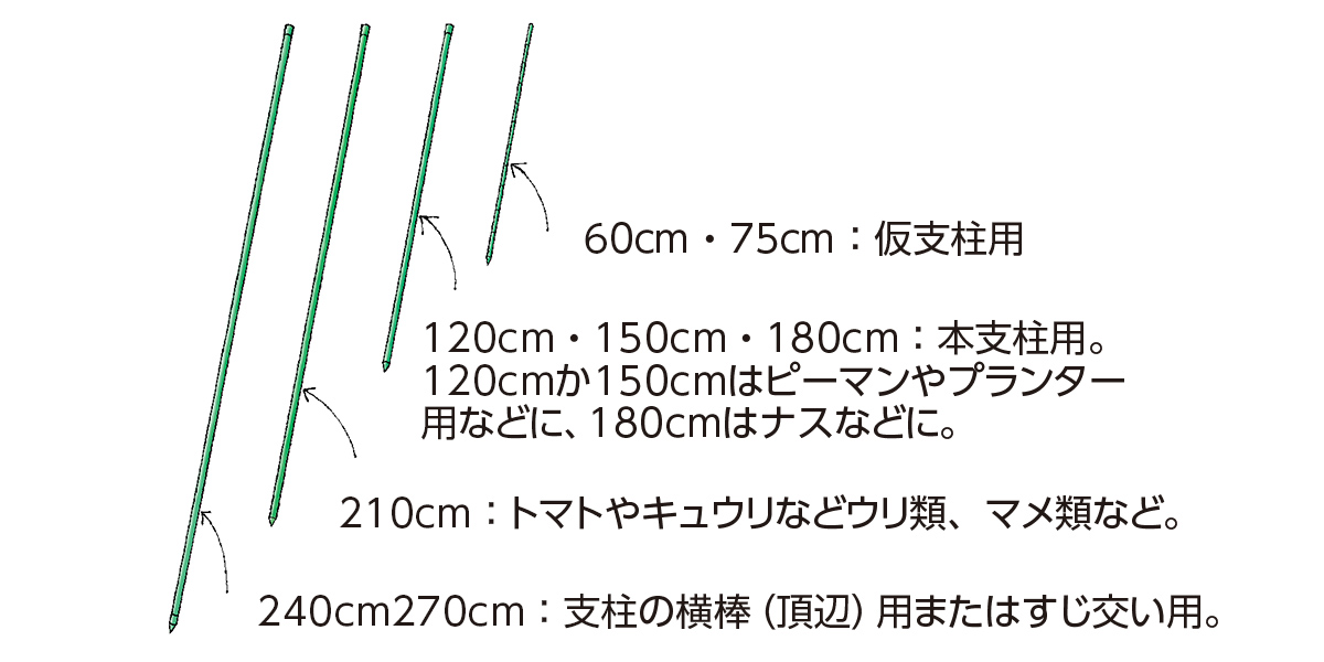 苗を植えつけた後、草丈が伸びる、実がなるものやつる性の野菜は、大きくなった株や実の重さを支えたり、伸びたつるを這わせたりするための支柱が必要になってきます。