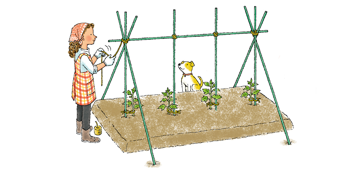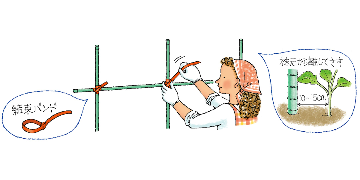いずれも植えつけ時には苗が倒れないように根付くまで「仮支柱」を立てて支えてやります。その後、生長に合わせて本支柱に差し替えて株を支えます。枝やつるが伸びる野菜は支柱だけではなく、ネットを張るなどしてつるを誘引する必要があります。野菜を立体的に育てられるので下葉を整理すると風通しや日当たりがよくなり、病気や害虫の予防にもなります。
