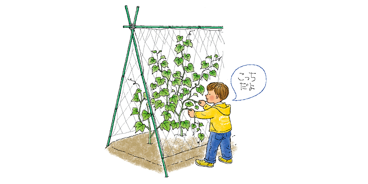 キュウリやニガウリ、エンドウなどはネットをかけて誘引します。