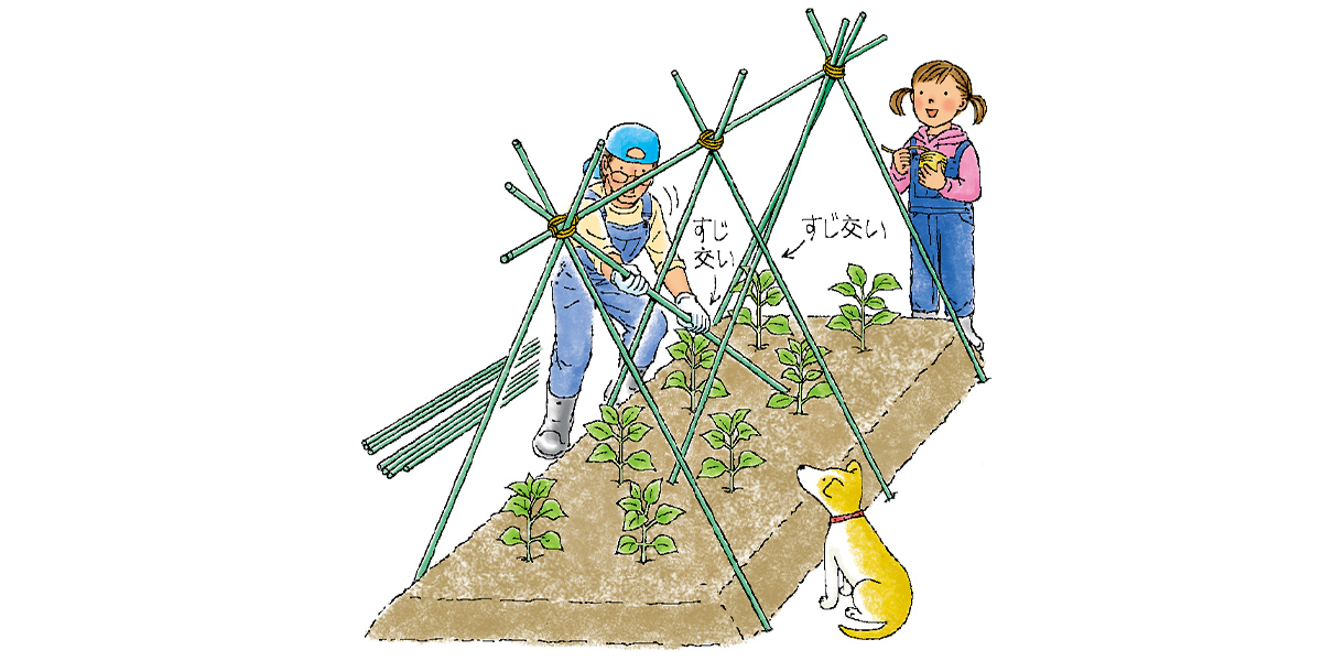補強用に両側から斜めに支柱を立てる(すじ交い)と強風にも強く安定感があります。スペースに余裕のある場合は畝の外側に支柱をさしましょう。
