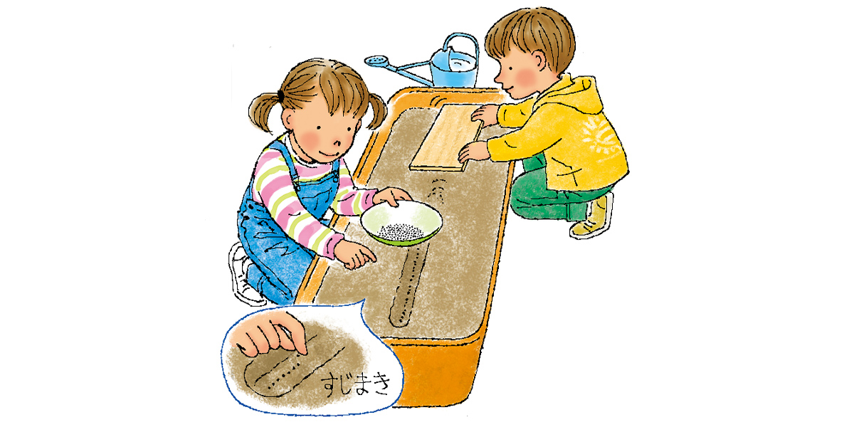 深さ1cmほどのまき溝をつけ、すじまきします。薄く土をかぶせて板などを使っておさえ、水やりしましょう。
