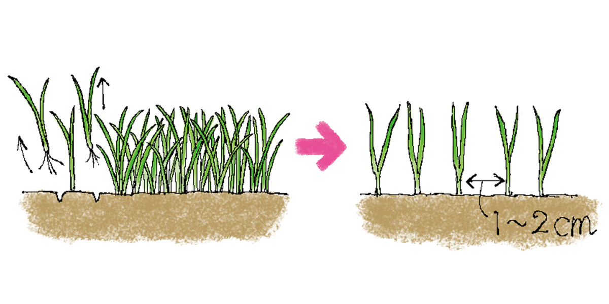 草丈が20cmくらい、葉数が4~5枚になったら根を傷つけないように掘り上げて1本ずつに分けます。