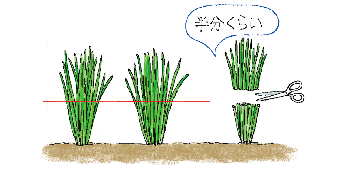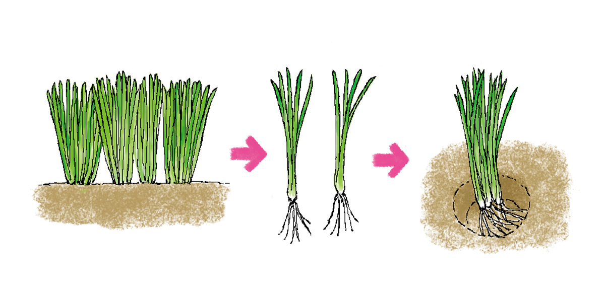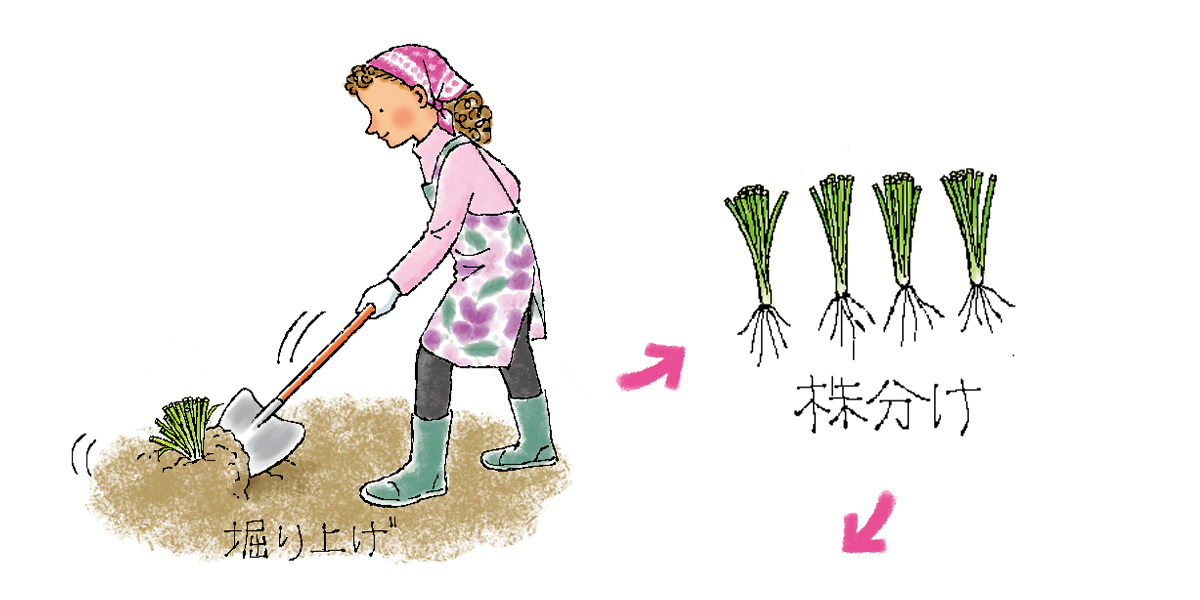 植えつけ後3~4年経ったら、春か秋に株元から4~5cmのところで刈り取り、根ごと掘り上げて株分けします。別の畑に深さ8~10cmの植え溝を掘り、4~5本ずつ株間20cmくらいに植えつけ、株の上部が少し出るくらいまで土をかぶせます。新葉が伸びてきたら植え溝がうまるくらいになるまで土をかぶせましょう。