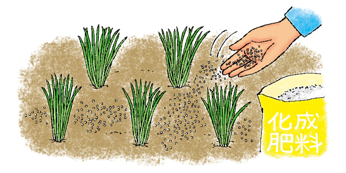茎葉が伸びて株分かれが始まった頃から、1m2あたり化成肥料(8-8-8)20g程度を施用し、株元に軽く土寄せします。生育を見ながら4週間に1回程度、同量を施用してください。