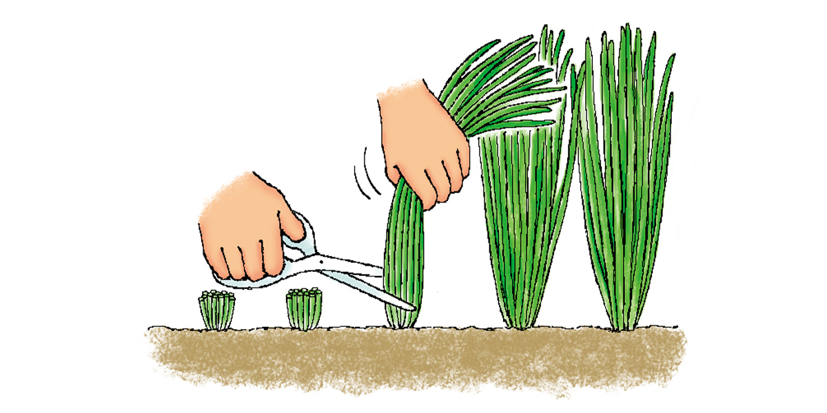 冷涼な気候を好み、冬は休眠して越冬します。植えつけ1年目は、伸びている葉を刈り取って(捨て刈り)株を大きく育てることに専念します。切り株から若い葉がグングン伸びてくるので、冬を越して2年目の春から収穫を始めましょう。株元を3~4cm残して収穫すると、また葉が伸びてきて、真冬と真夏を除いて年に何回か収穫が楽しめます。