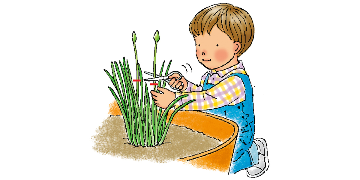 春先から伸びた葉が20~25cmくらいになったら、株元を2~3cm残してハサミを使って収穫します。1ヵ月程でまた新葉が伸びて収穫できます。