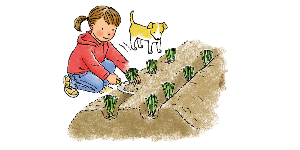 15~20cm間隔で深さ10cmの植穴を掘り、1ヵ所3~5本ずつ、根を土の上に置いて浅く土をかぶせ、たっぷり水やりしましょう。6月中旬から10月下旬まで可能(夏の高温乾燥期は避ける)です。