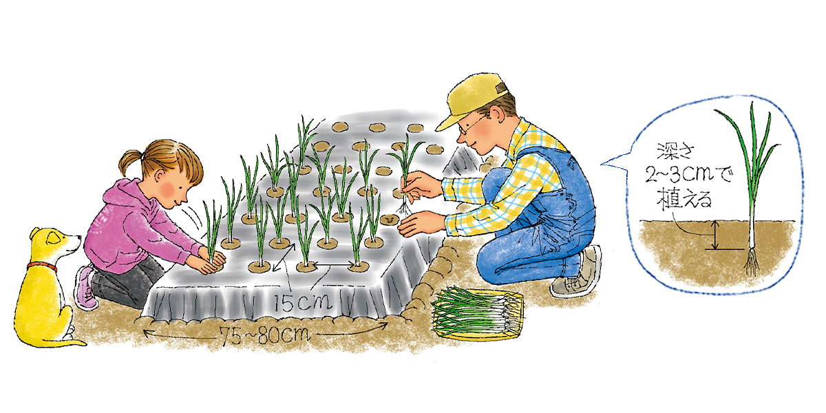 たねまきから始めると苗作りに2ヵ月以上かかり、植えつけに適した苗をそろえるのが難しいので購入苗がおすすめです。植えつけ適期が遅れると、根付く前に寒さに負けて枯れてしまい、逆に早すぎたり、大きすぎる苗を植えると、春先、玉が肥大する前にとう立ち(ネギ坊主が出る)しやすくなるので、生育が旺盛なようであれば、年内の追肥は控えます。