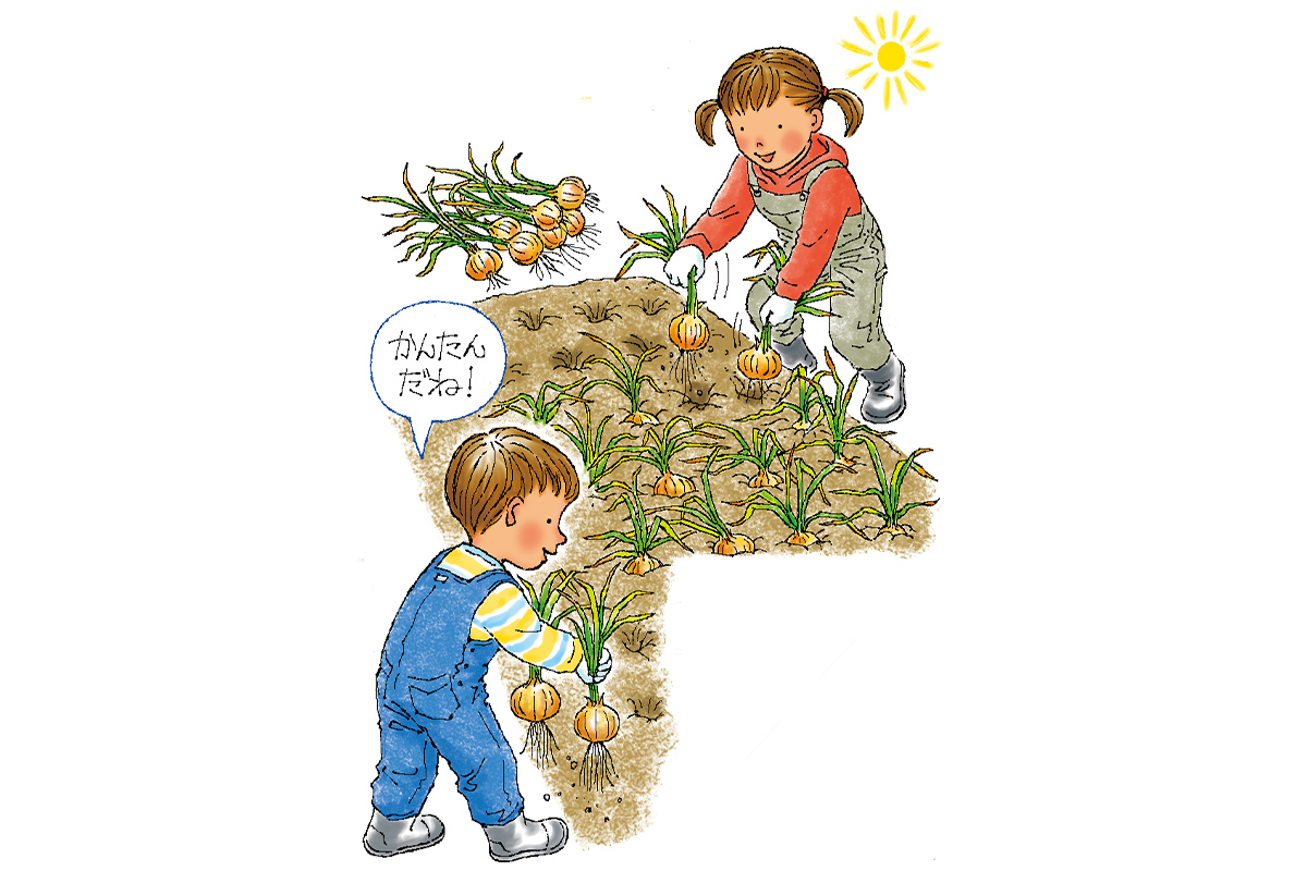 球が十分に肥大すると茎が根元から倒れてきます。全体の7~8割が倒れたら収穫適期です。雨の日を避け、晴天が続いて土が乾いた日を選んで抜き取ります。そのまま土の上に並べて1~2日乾かしましょう。