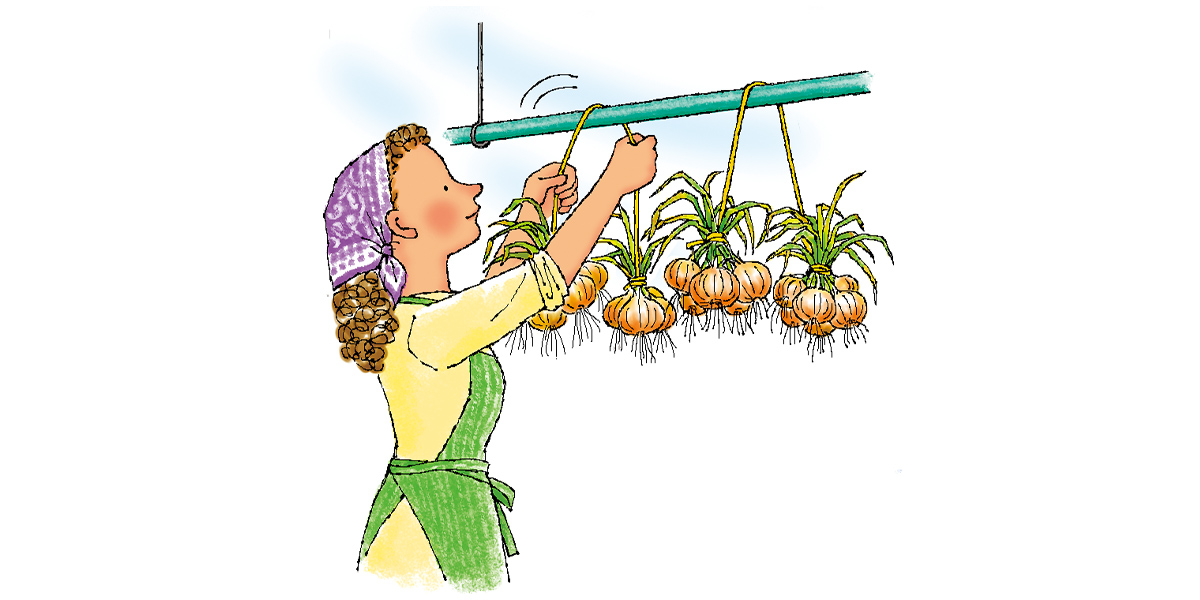 数日中に食べる場合は、葉と根を切り落として冷暗所で保管します。長期保存する場合は葉や根は切らずに4~5個ずつまとめてひもで縛り、風通しのよい軒下などの日陰に吊るしましょう。湿気が多い場所は腐りやすいので注意が必要です。