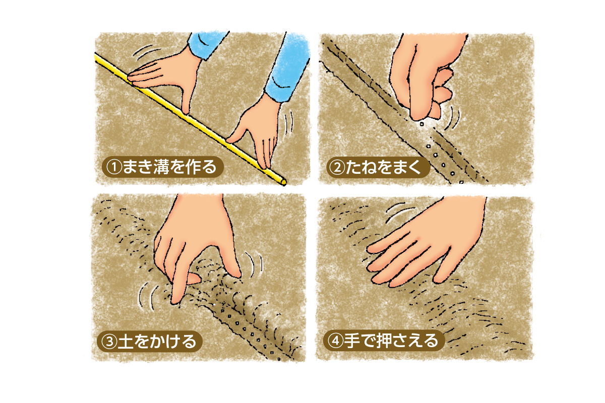 平らにした土の表面に支柱や板などを押し当ててまき溝を作り、たねが重ならないようにできるだけ均一にまきます。溝の両側の土を指でつまむようにして、たねに土をかぶせます。たねと土が密着するように手のひらで軽く押さえ、たっぷりと水やりしましょう。