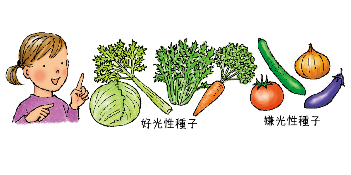 野菜のたねには光があった方が発芽しやすい「好光性種子」と、光がない方が発芽しやすい「嫌光性種子」があります。かぶせる土の厚さはたねの直径の2~3倍が目安といわれていますが、好光性種子の場合はごく薄く土をかけましょう。