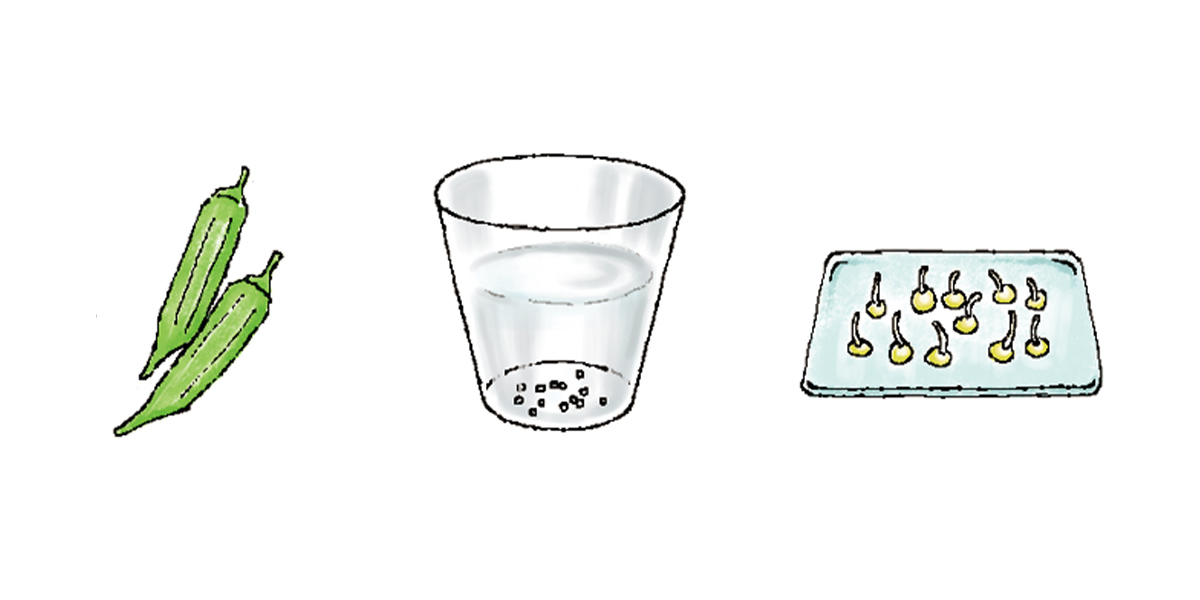 オクラやニガウリなど皮が硬いたね(硬実種子)は、一昼夜水につけて吸水させてからまくと発芽がよくなります。また、温度が高い時期(25℃以上)にレタスやホウレンソウなどのたねをまく場合は、一昼夜水につけた後、冷蔵庫に2~3日入れて「芽出し」をしてからまきましょう。