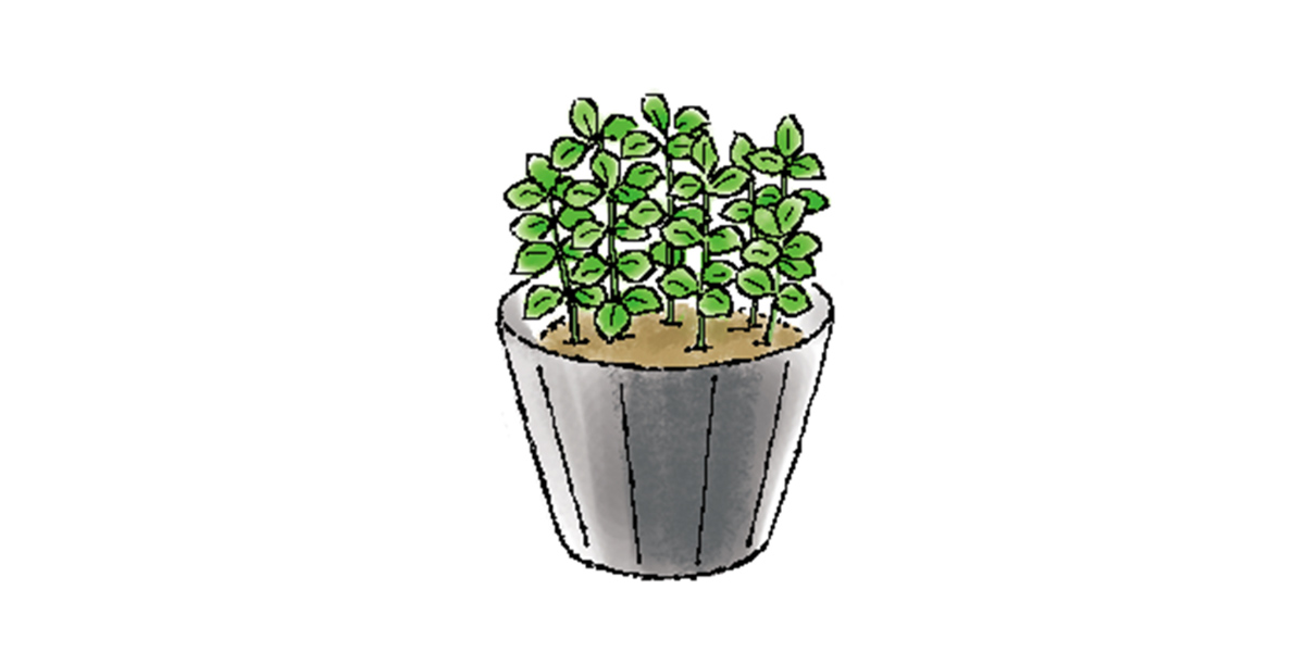 発芽したら、混んでいるところを間引きます。本葉3枚くらいまで順次間引き、それぞれのハーブにあった間隔で1本立ちにします。