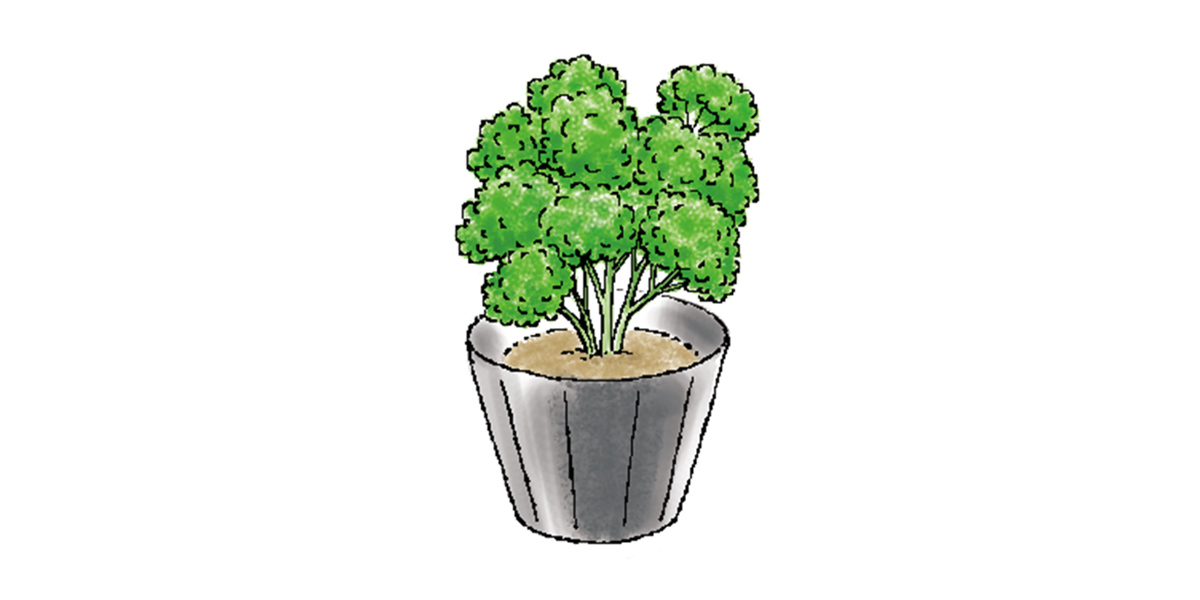 料理の付け合わせに欠かせない定番ハーブ。葉が縮れたモスカールドパセリと平たいイタリアンパセリがあります。窓辺の日当たりのよい場所に置いて、水切れしないように管理しましょう。