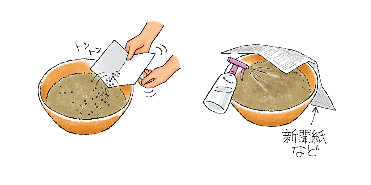 細かいたねは古いハガキなどを使ってばらまきにします。薄く土をかけて霧吹きなどでやさしく水やりします。発芽するまで土が乾かないように新聞紙などをかぶせておくとよいでしょう。