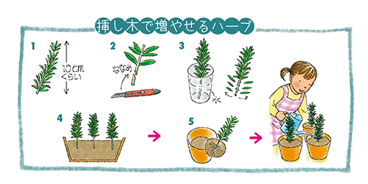 タイム、セージ、バジル、ローズマリー、ミント、レモンバームなどは挿し木で増やせます。