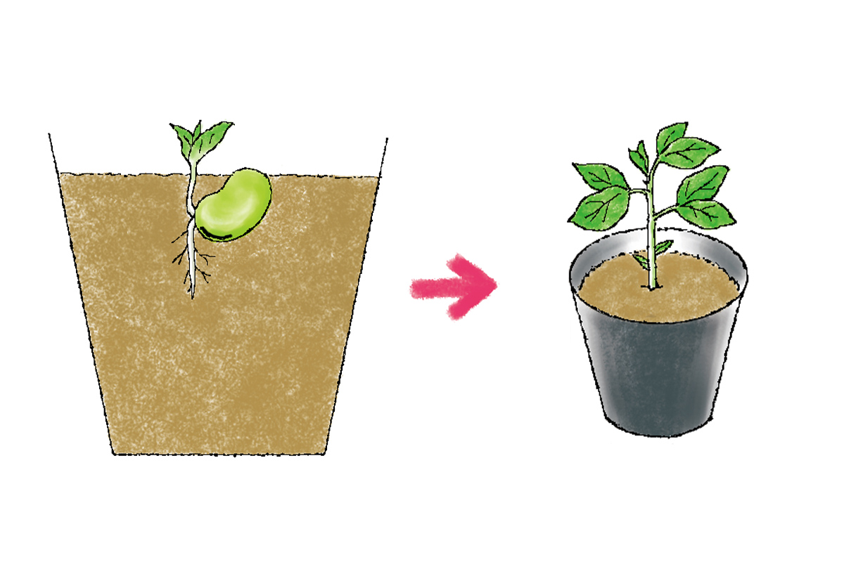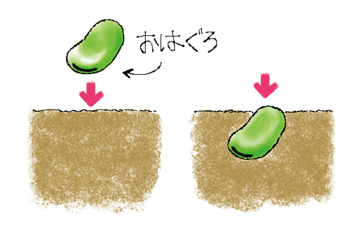 畑に直まきできますが、鳥に食べられてしまうリスクがあるのでポットまきして育てるのがおすすめです。ポリポット(6~9cm)にお歯黒(豆のくぼんだ部分に入っている黒い線のこと)を斜め下に向けて土に押し込み、頭が少し見えるくらいの浅植えにします。1ポットに1粒まき、たっぷり水やりします。