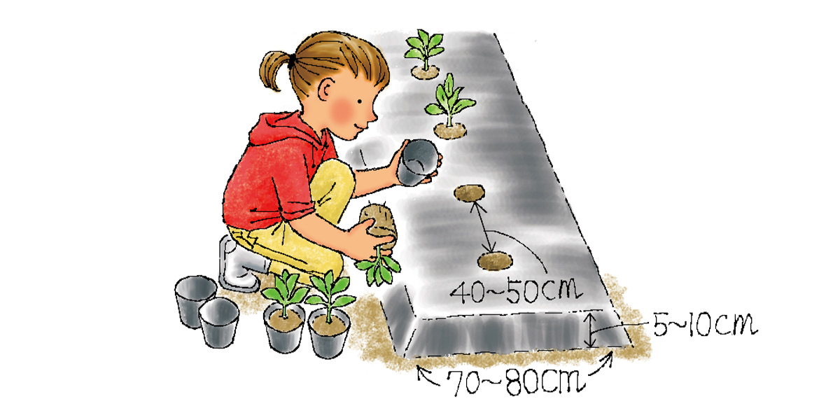 本葉2~3枚になったら、根鉢を崩さないように取り出し、植え穴に植えつけます。株元を軽く押さえ、たっぷり水やりしましょう。本葉5枚より大きくしないで冬越しさせます。