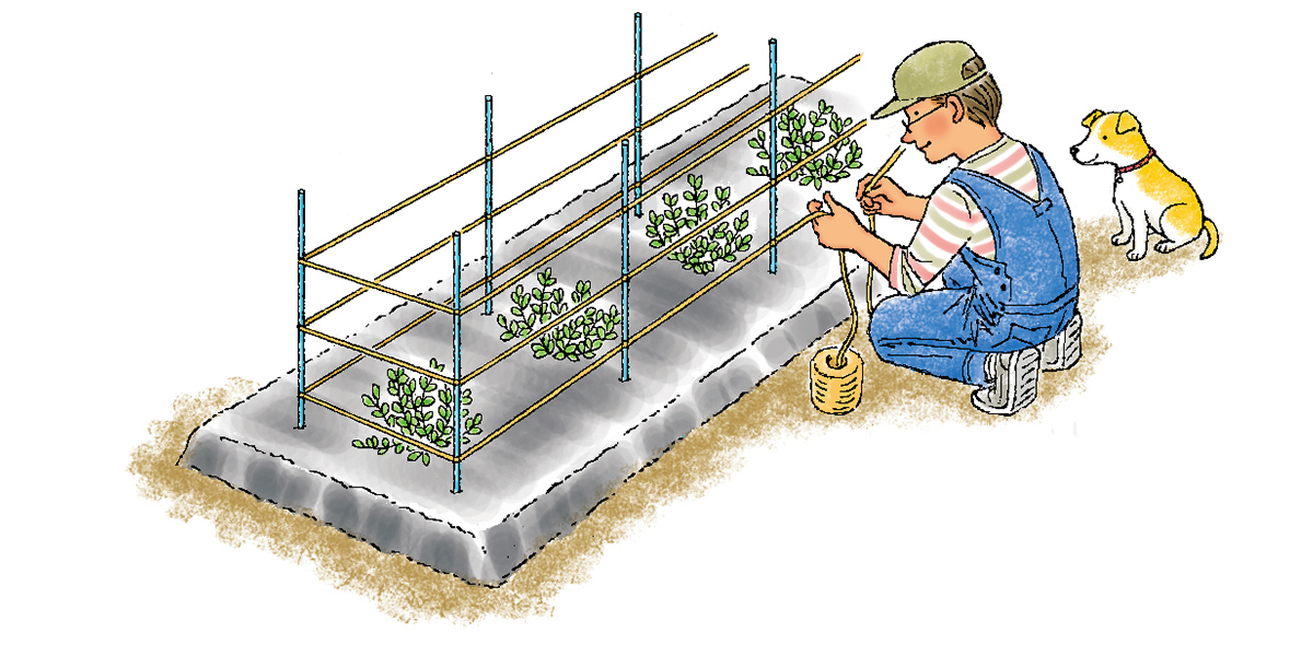 株が大きく広がって倒れやすくなるので、畝の回りに支柱を立てます。20cm間隔くらいで何段かヒモを張り、株の成育に合わせて徐々に上の方に誘引してやりましょう。