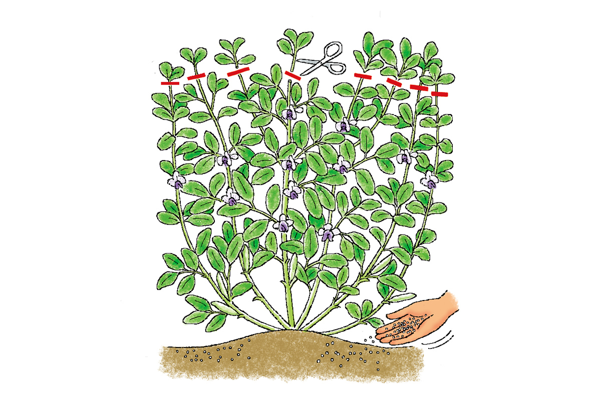 元肥はたねまきの1週間前に、化成肥料(8-8-8なら1m2あたり100g、14-14-14なら同50g)を散布し、土に混ぜ込みます。マメ科植物の根には、空気中の窒素ガスをアンモニアに変換し、肥料として植物に与えてくれる根粒菌という細菌が共生しています。施肥量が多くなり過ぎないように注意してください。