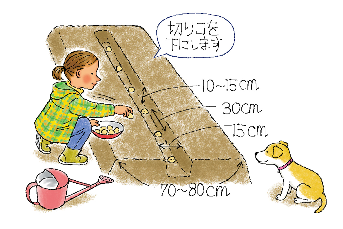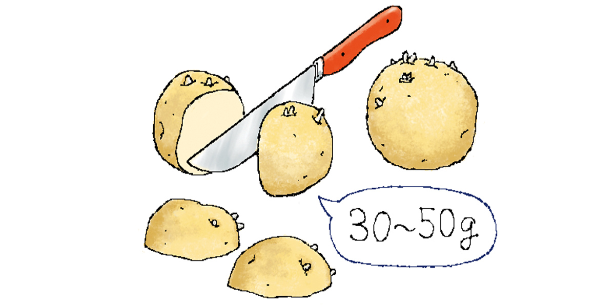 大きな種イモは切り分けて、腐りにくくするために切り口を2〜3日陰干ししてから植えつけます。新しいイモは種イモの上にできるので、必ず土寄せをしてイモが土から顔を出して緑化するのを防ぐことがポイントです。