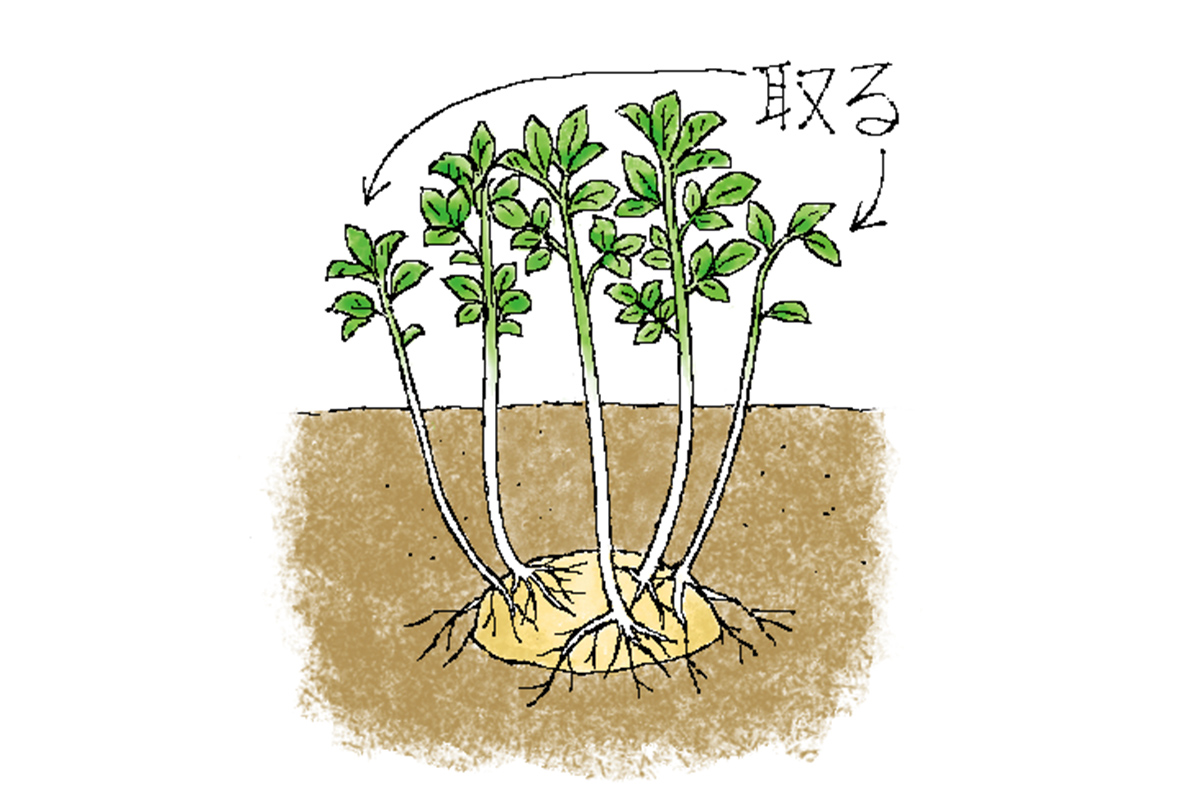 芽が10cmくらいに伸びたら、元気の良い芽を2~3本残し、他の芽はかき取ります。芽をかき取ると大きなイモに育ちます。