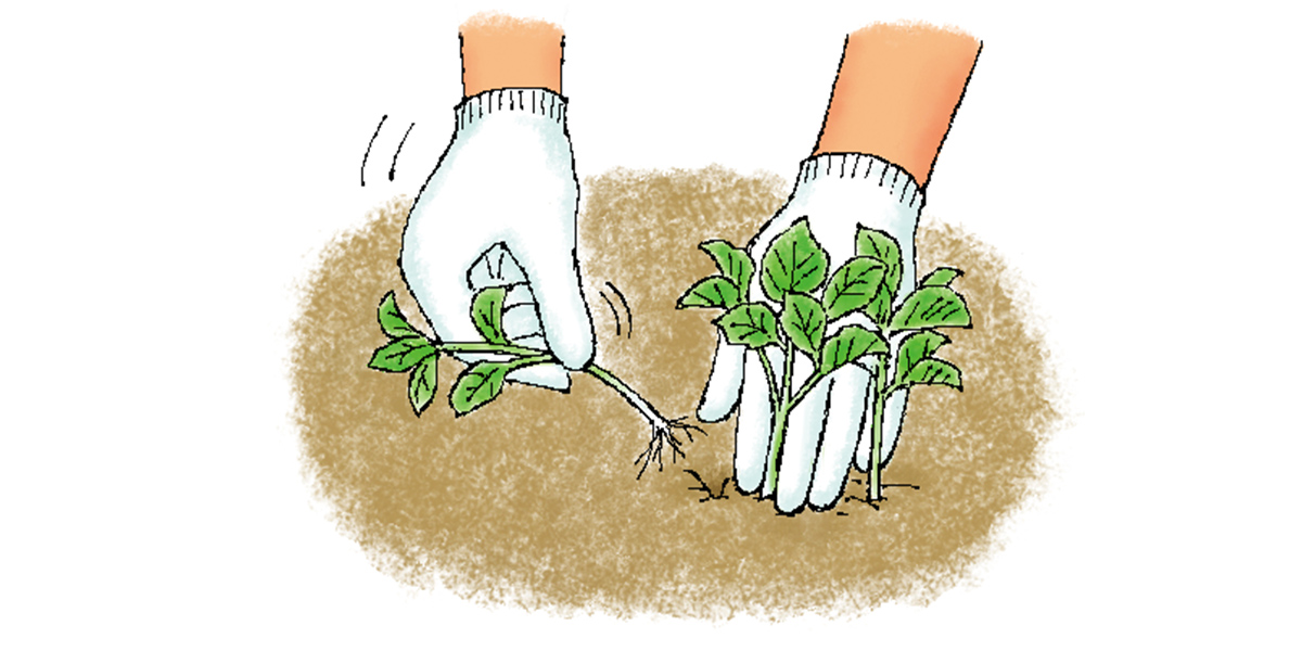子イモは種イモより浅い場所にできるので、土寄せが足りないとイモが日に当たって緑化し品質が低下します。芽かきをして追肥した後と、草丈が20cm程度になった頃の2回、土寄せをします。しっかり土寄せをしてイモができる場所を作りましょう。