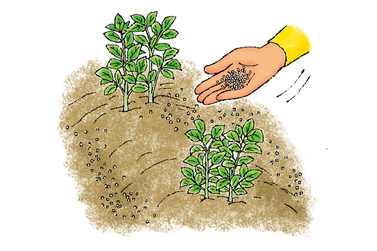 元肥は植えつけの1週間前に、1m2あたり化成肥料(8-8-8なら100g、14-14-14なら50g)を散布し、土に混ぜ込みます。
