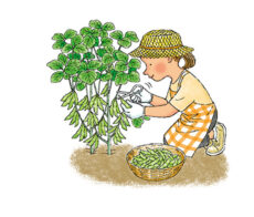 開花から1ヵ月くらいで収穫します。実がふっくらして、莢の光沢が無くなり表面にシワが入り始めたら収穫のサインです。1つ採って莢を開け、実が丸々太っていたらOK。ハサミを使って収穫しましょう。タイミングを逃すと実が硬くなってしまうので、採り遅れには要注意です。