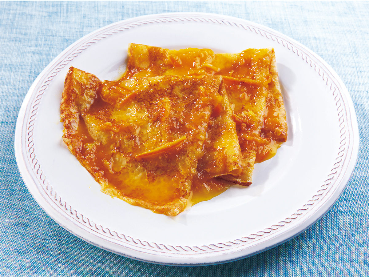 ※クレープシュゼットは、クレープを柑橘ソースで軽く煮た温かいデザートです。 果汁の酸味が少ないときは、レモン果汁を加えたり、好みでグランマニエ酒を加えると香り高く仕上がります。グランマニエ酒はブランデーで代用できます。