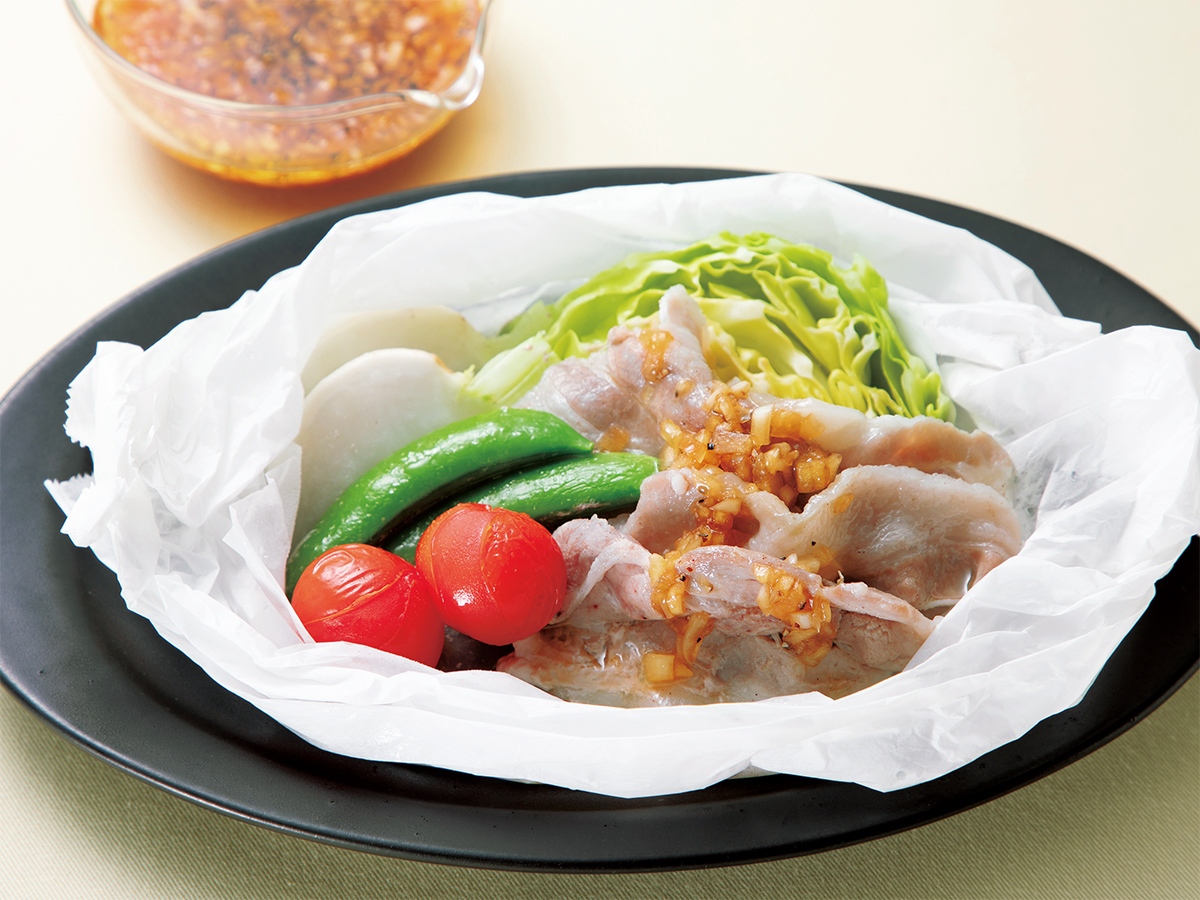 旬の野菜を豚肉と蒸した手軽な時短料理です。春野菜の包み蒸し