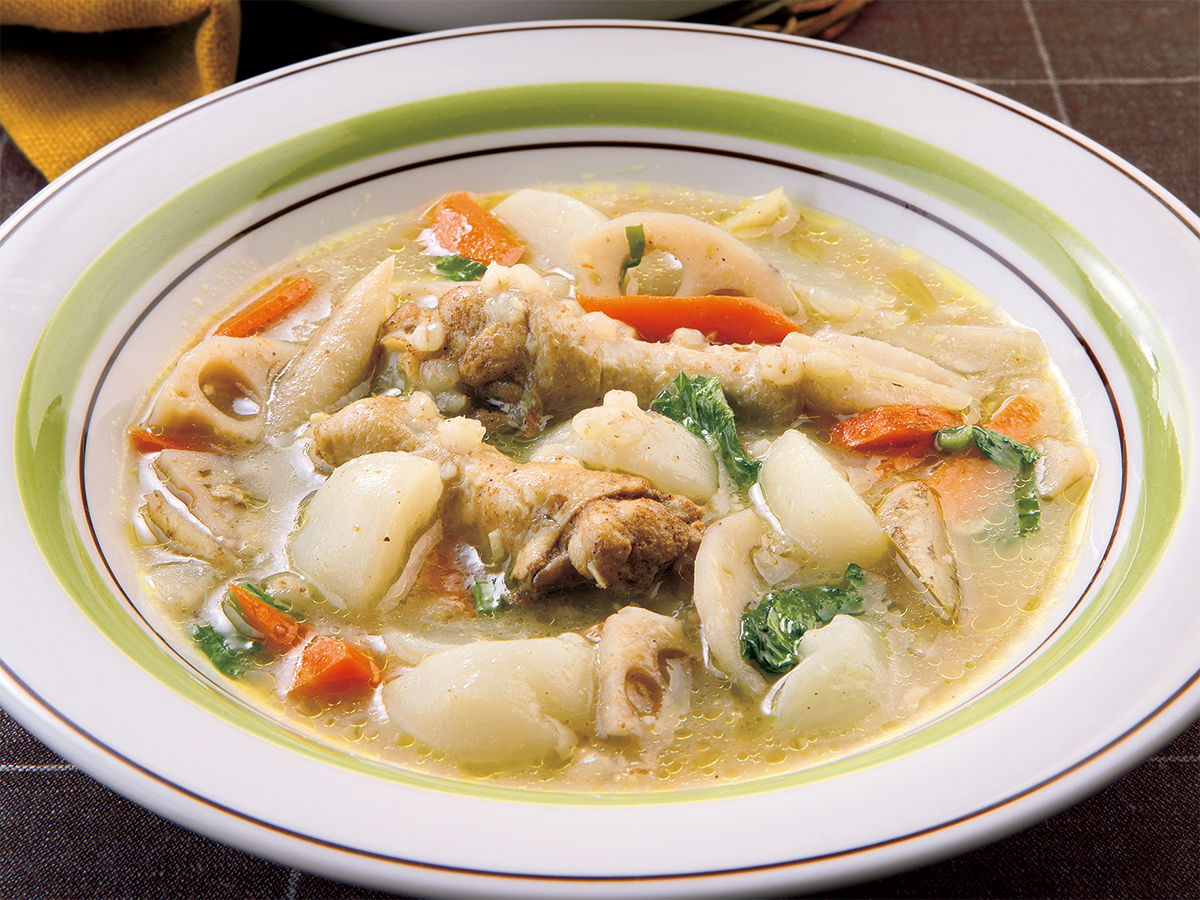 体が温まる、もち麦入りのカレー風味のスープです鶏手羽と根菜のスープ
