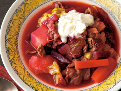 2を器に盛って3をかける。楊枝を外してたまねぎのビネガーソテーを盛り、クレソンとラディッシュを添える。
