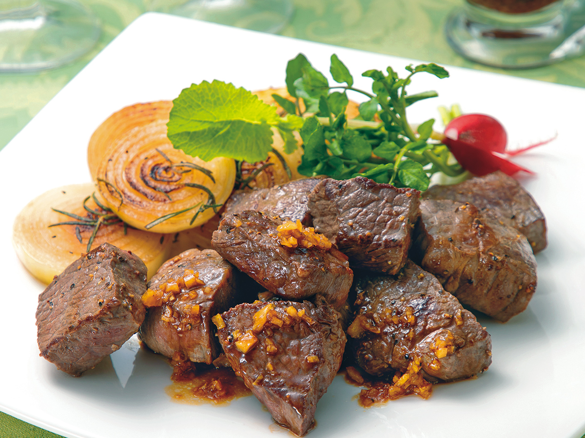 フライパンに油を入れて中火で熱し、肉を1切れ入れてジュッと音がしたらすべての肉を入れ中弱火にして1分ほど焼き、上下を返して2分焼いて焼き色をつける。断面が焼けていない場合は、フライパンを前後に揺すって転がしながら焼く。アルミホイルに取り出し、口を閉じて5〜6分休ませる。