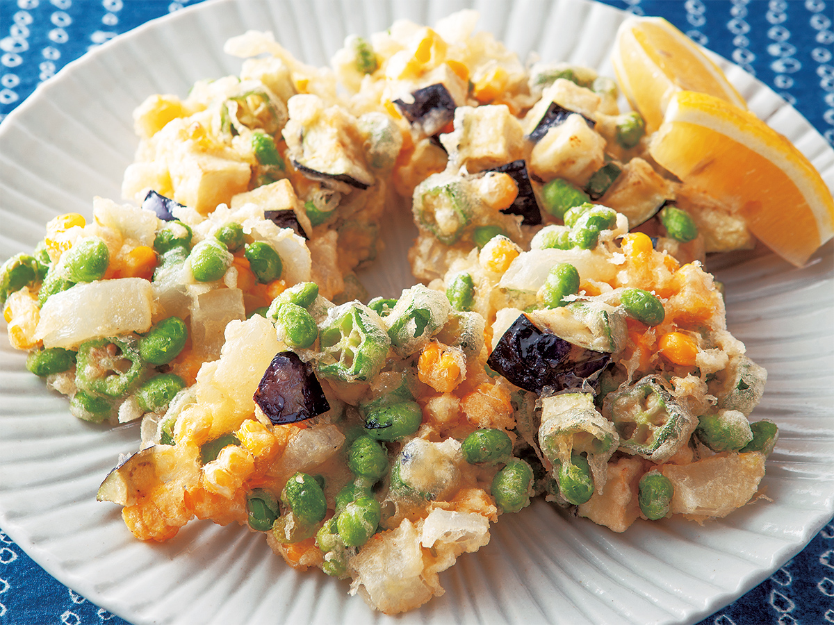 フライパンの深さの1/2まで油を注ぎ、中温に熱し、5の具を穴あきのスプーンやおたまにのせて、油に落とし入れる。3~4個入れ、途中裏に返して全体で2~2分30秒程揚げて取り出す。天かすをすくい取り、残りも同じように揚げる。