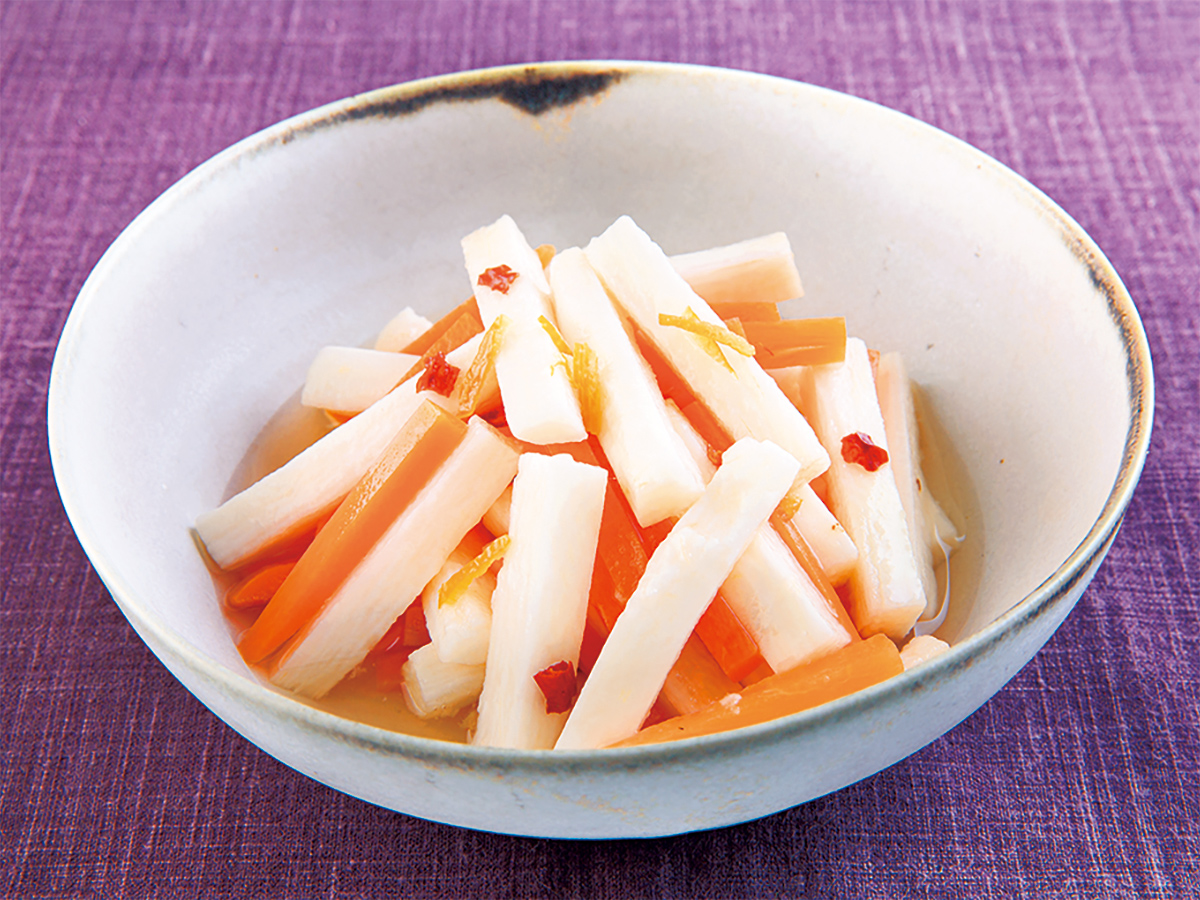 にんじんは洗って皮つきのまま、長さ4~5cm幅6~7mmの拍子木切りにし、熱湯で1分程、硬めにゆでて冷ましておく。