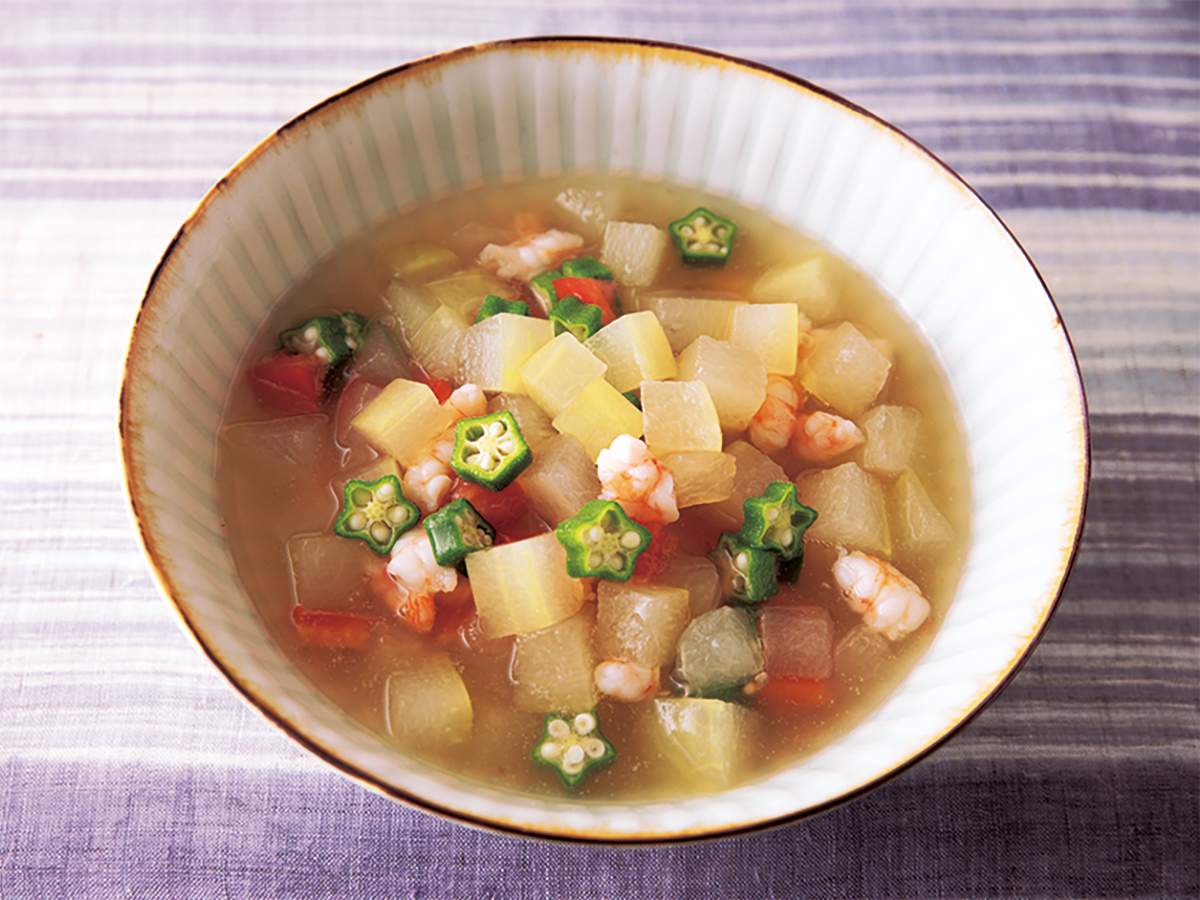 冬瓜は種を取って皮をむき、1~1.5cm角に切る。オクラは5mm幅の輪切り、トマトは横半分に切って種を取り、1cm角に切る。