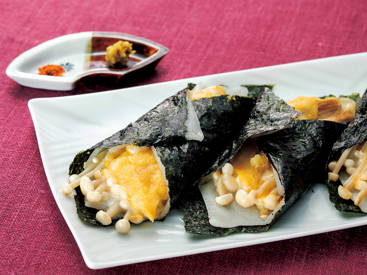 4. 餅とえのきたけに火が通ったら取り出して、焼き海苔にのせて巻く。お好みで七味やゆずこしょうを添える。