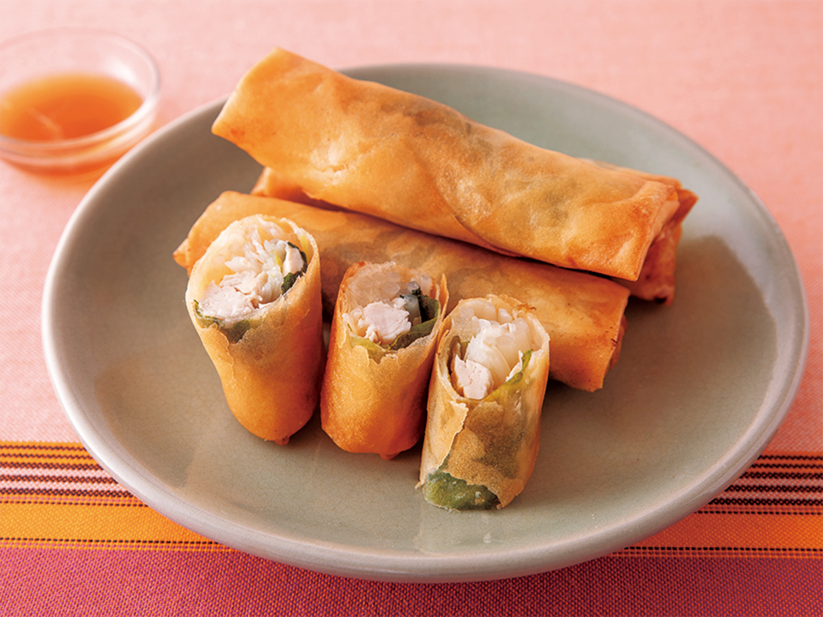春巻きの皮を広げて、大葉2枚を敷き、1、2を横長に並べて包む。包み終わりを水溶き小麦粉(分量外)で留める。同様に10本作る。