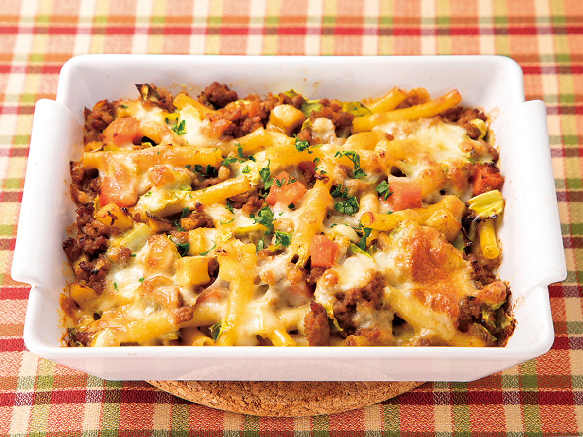 1. 鍋に湯を沸かして塩小さじ1(分量外)を加え、マカロニを表示のゆで時間より1分短くゆでてザルに取る。