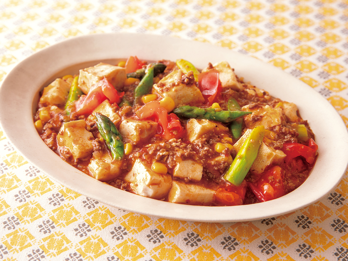 豆腐は水きりし、1.5cmの角切りにする。トマトは一口大に切る。アスパラガスは根元の硬い部分をピーラーでむき、2cm長さの斜め切りにする。ねぎ、にんにく、しょうがはみじん切りにする。