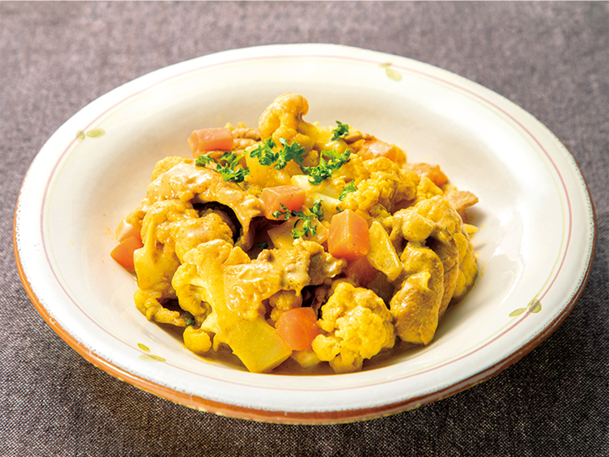 カリフラワーは小房に分け、茎は皮をむいて大きめの乱切りにする。たまねぎは2cm角、にんじんは1cm角、豚肉は大きめの一口大に切る。