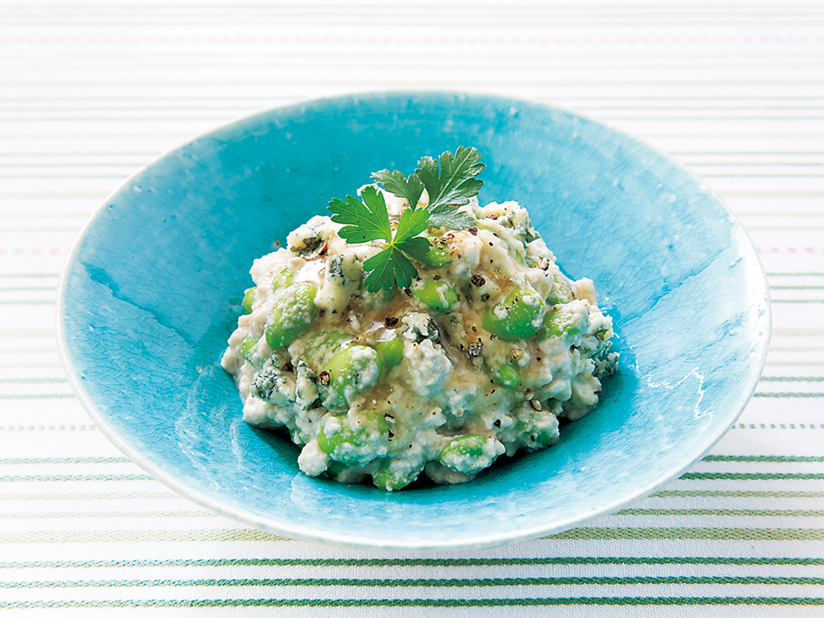 練りごま、すりごま、塩、みりんを加えてよく混ぜ合わせ、枝豆、1cm角に切ったブルーチーズを加えて軽く和える。